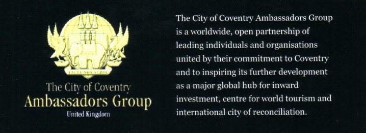 I was recently approached by The City of Coventry Ambassadors Group inviting me to become an ambassador for Coventry representing the arts. It was a great honour for me to be invited into such a prestigious group, to whose invitation I have most graciously accepted.